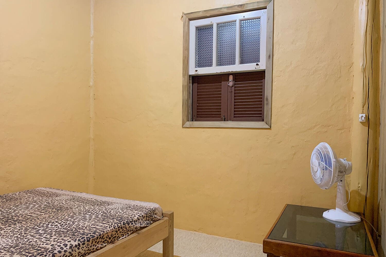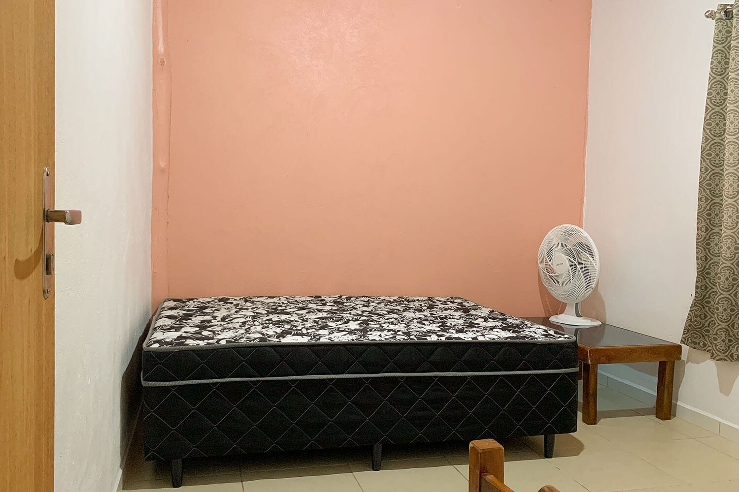 2 quartos, cada um com 1 cama de casal e ventilador.